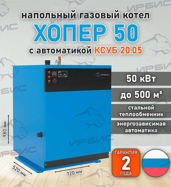 Напольный газовый котел «Хопер 50» с автоматикой КСУБ 20.05 предназначен для водяного отопления жилых, промышленных, складских и прочих помещений площадью до 500 м².