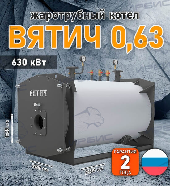 «Вятич 0,63» — водогрейный жаротрубно-дымогарный котел мощностью 0,63 МВт с реверсивной топкой. Котел «Вятич», в зависимости от типа горелочного устройства, может работать на природном газе или жидком топливе и выполнен в газоплотном исполнении с работой под наддувом.